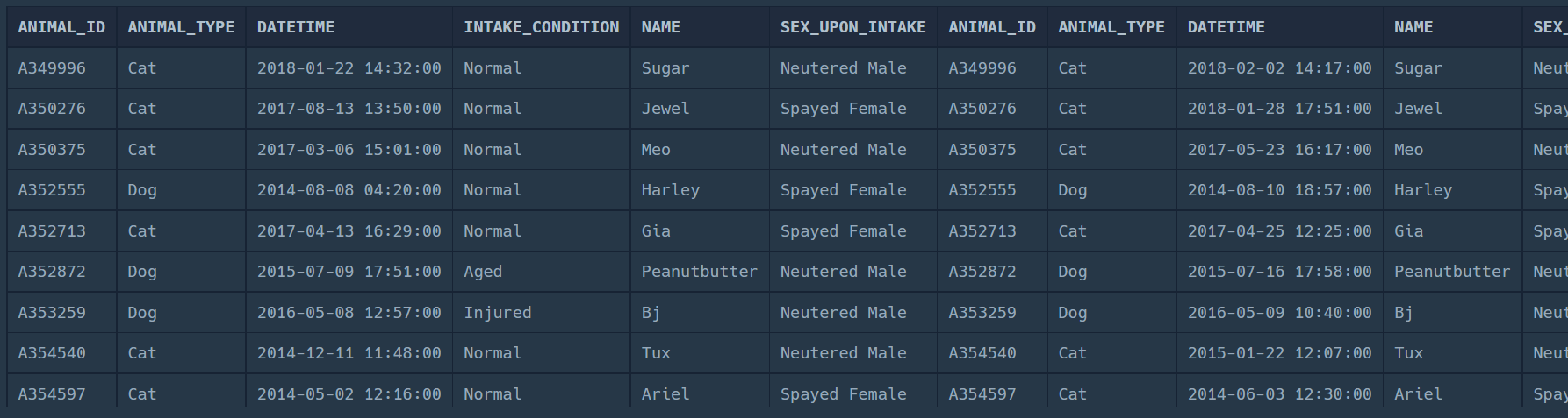 - 이 결과에서 ANIMAL_OUTS의 DATETIME이 ANIMAL_INS의 DATETIME보다 작은 ANIMAL_ID와 NAME을 출력하면된다!