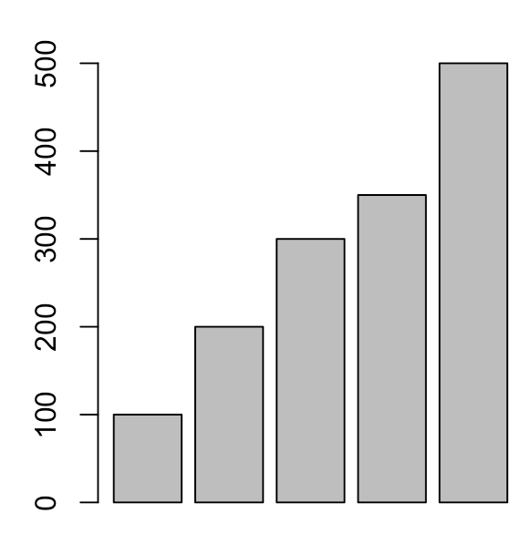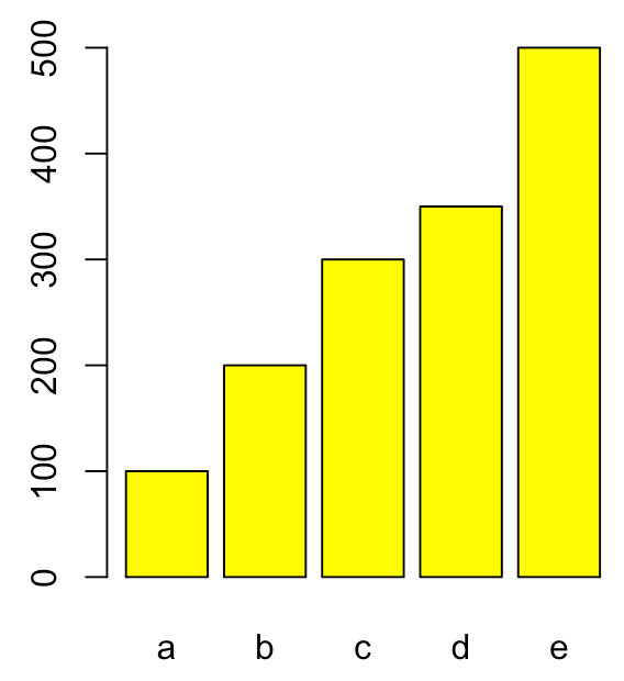 #회색 막대 그래프 그리기 > plot.new() > a<-c(100,200,300,350,500) > barplot(a) #노란색 막대 그래프 그리기 > plot.new() > a<-c(100,200,300,350,500) > barplot(a,name=c('a','b','c','d','e'),col="yellow") - 결과