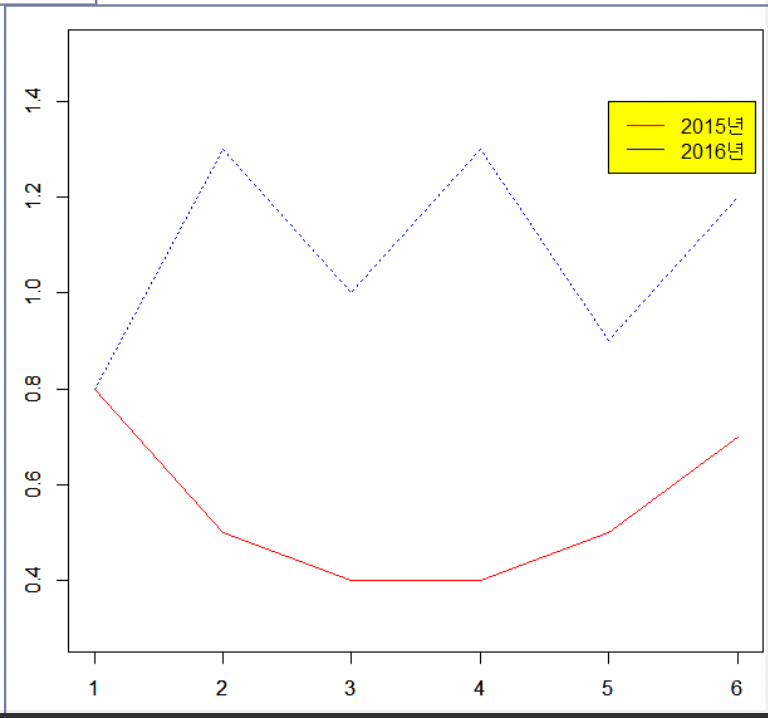 > plot.new() > y1<-c(0.8,0.5,0.4,0.4,0.5,0.7) > y2<-c(0.8,1.3,1.0,1.3,0.9,1.2) > x<-c(1:6) > par(new=TRUE) > plot(x,y1,ylab="소비자물가상승률",type='l',col='red',ylim=c(0.3,1.5)) > par(new=TRUE) > plot(x,y2,lty="dotted",type='l',col='blue',ylim=c(0.3,1.5)) > legend(5,1.4,legend=c("2015년","2016년"),lty=1,bg="yellow",col=c("red","blue")) - 결과